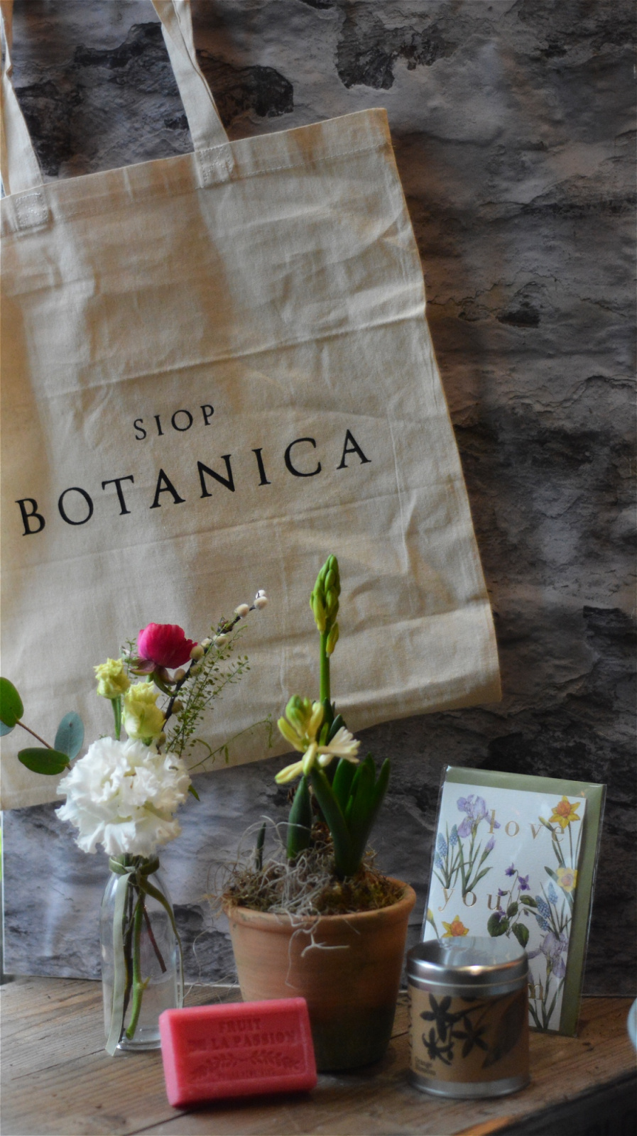 One of our Siop Botanica tote bags filled with niceties. Included in the bag will be a posy vase of Spring flowers, a vintage clay pot filled with bulbs, a Marseille Soap, a St Eval scented candle tin and a greetings card by Catherine Lewis.