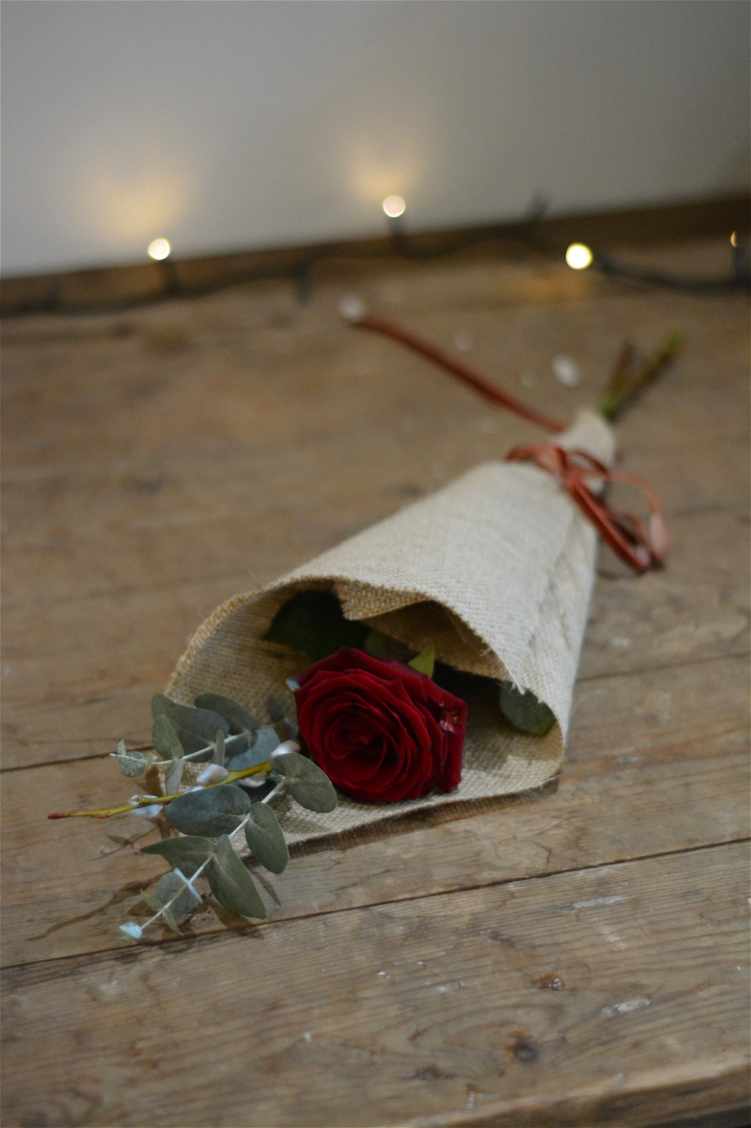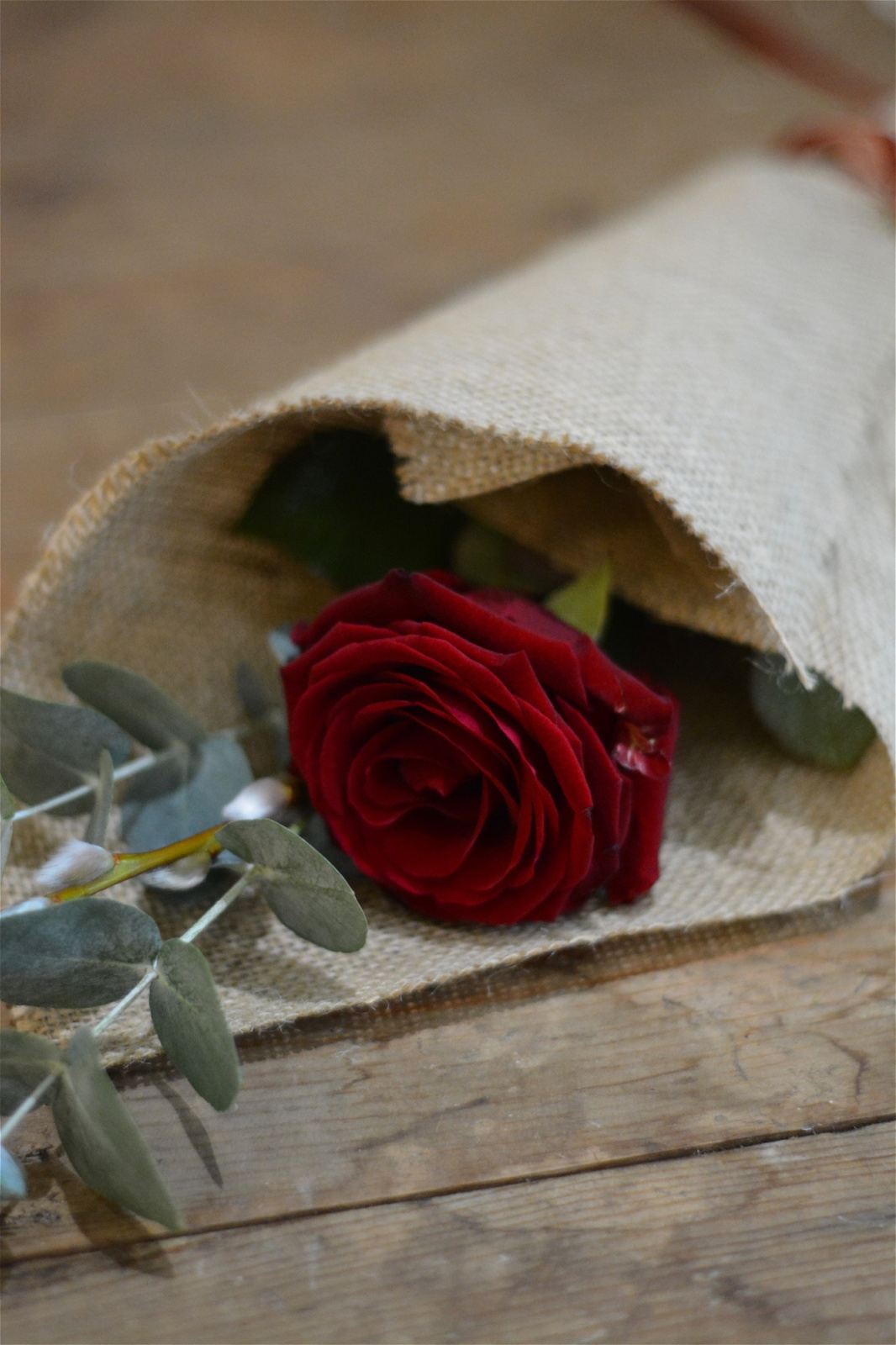 A single long stemmed red rose wrapped in hessian with eucalyptus and pussy willow.